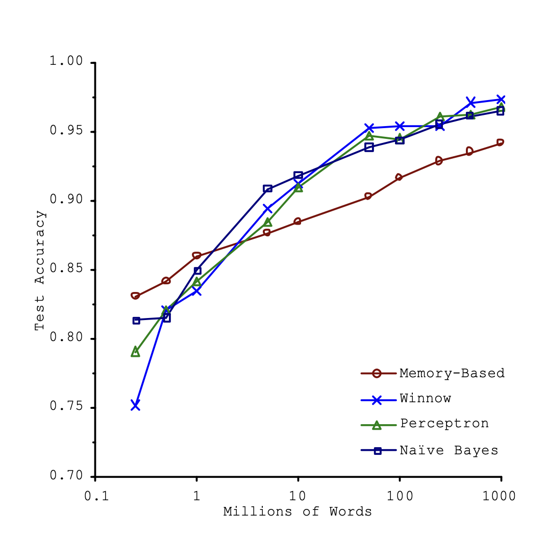 As the author put it, “these results suggest that we may want to reconsider the trade-off between spending time and money on algorithm development versus spending it on corpus development”.