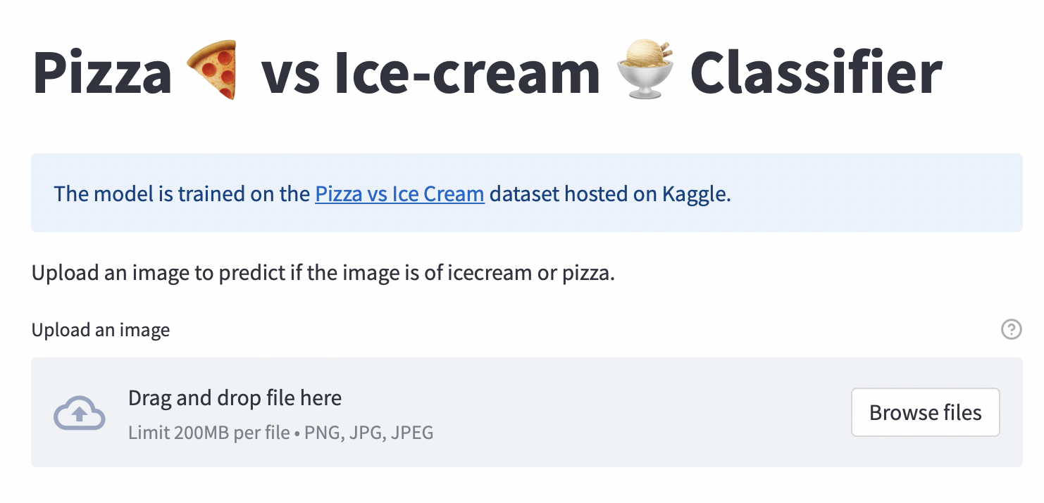 A Deep Learning Vision Classifier built on Tensorflow to classify the provided image between ice cream ๐จ and pizza ๐. This is a simple exercise to start with machine learning. You can check the app at: https://pizza-vs-icecream.streamlitapp.com/ In this project, we will be looking at the dataset journey(from gathering to preparation), and then will jump into the python code for creating the model, the FlaskAPI backend, and Streamlit python code. Dataset The dataset used is hosted on Kaggle, and the data was captured from Freepik using python script. Once the data was captured, Roboflow was used to organize and annotate. Roboflow can be used for more advanced features like augmentation, pre-processing, getting more examples, and exporting the data in different formats. ...